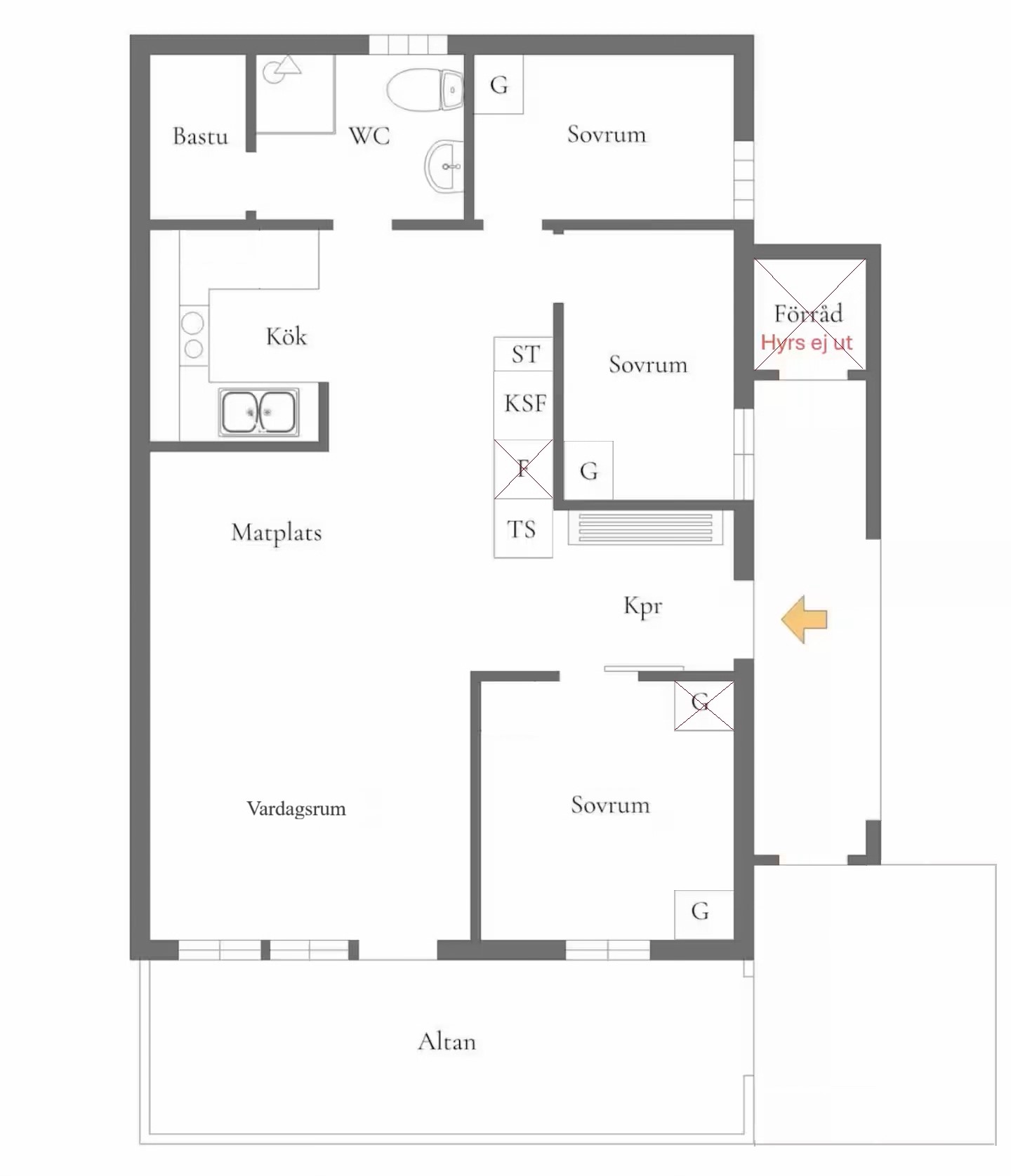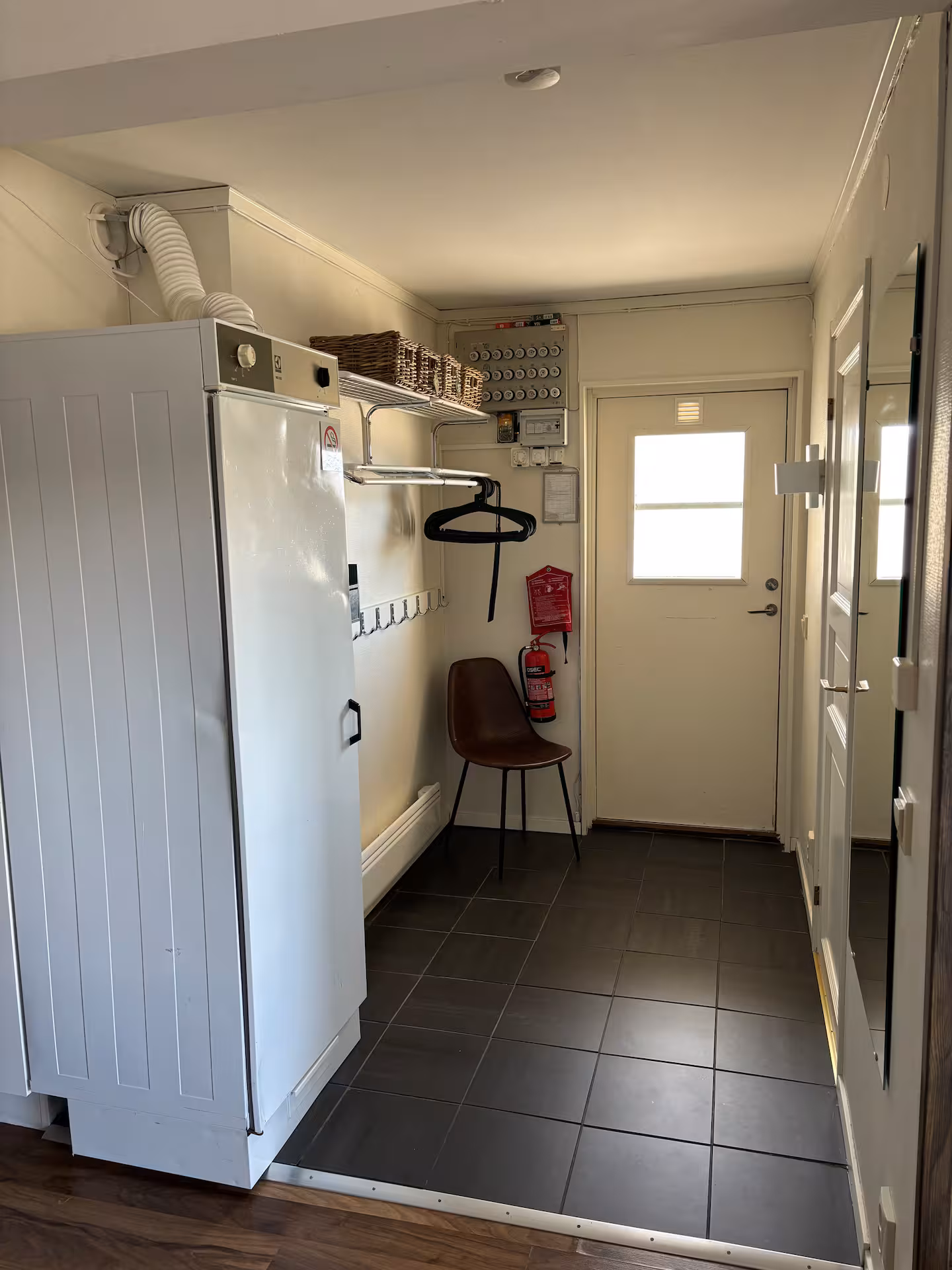 Lägenheten har en innerhall med torkskåp och golvvärme samt en ytterhall som också går att låsa. Utanför lägenheten finns en terrass med och utan tak. På sommaren finns även grillmöjligheter för den som önskar.
