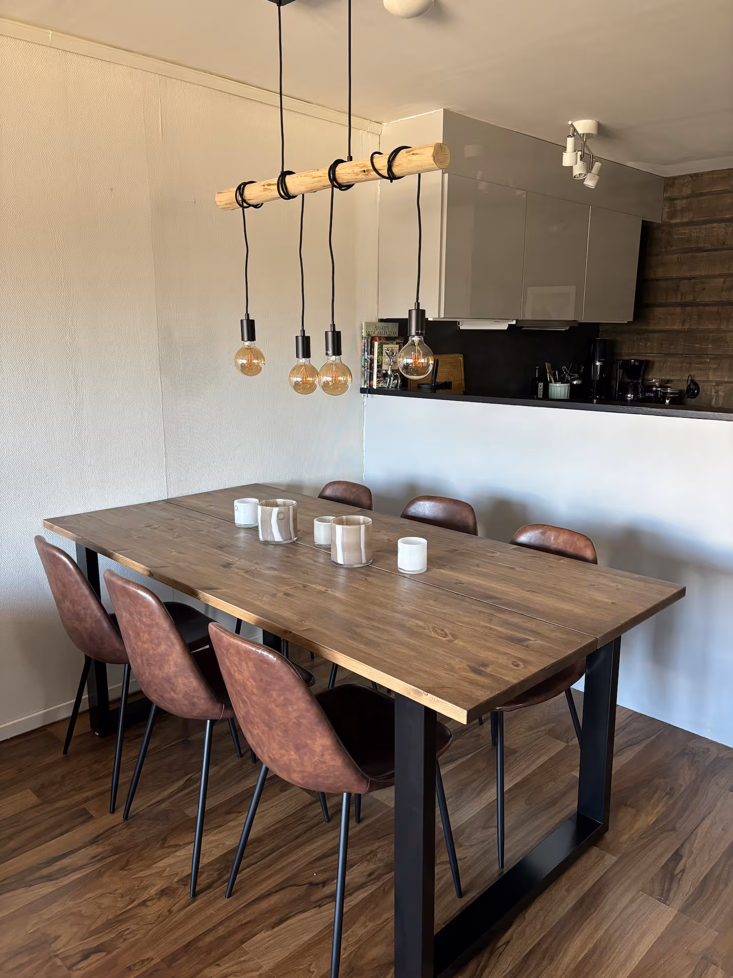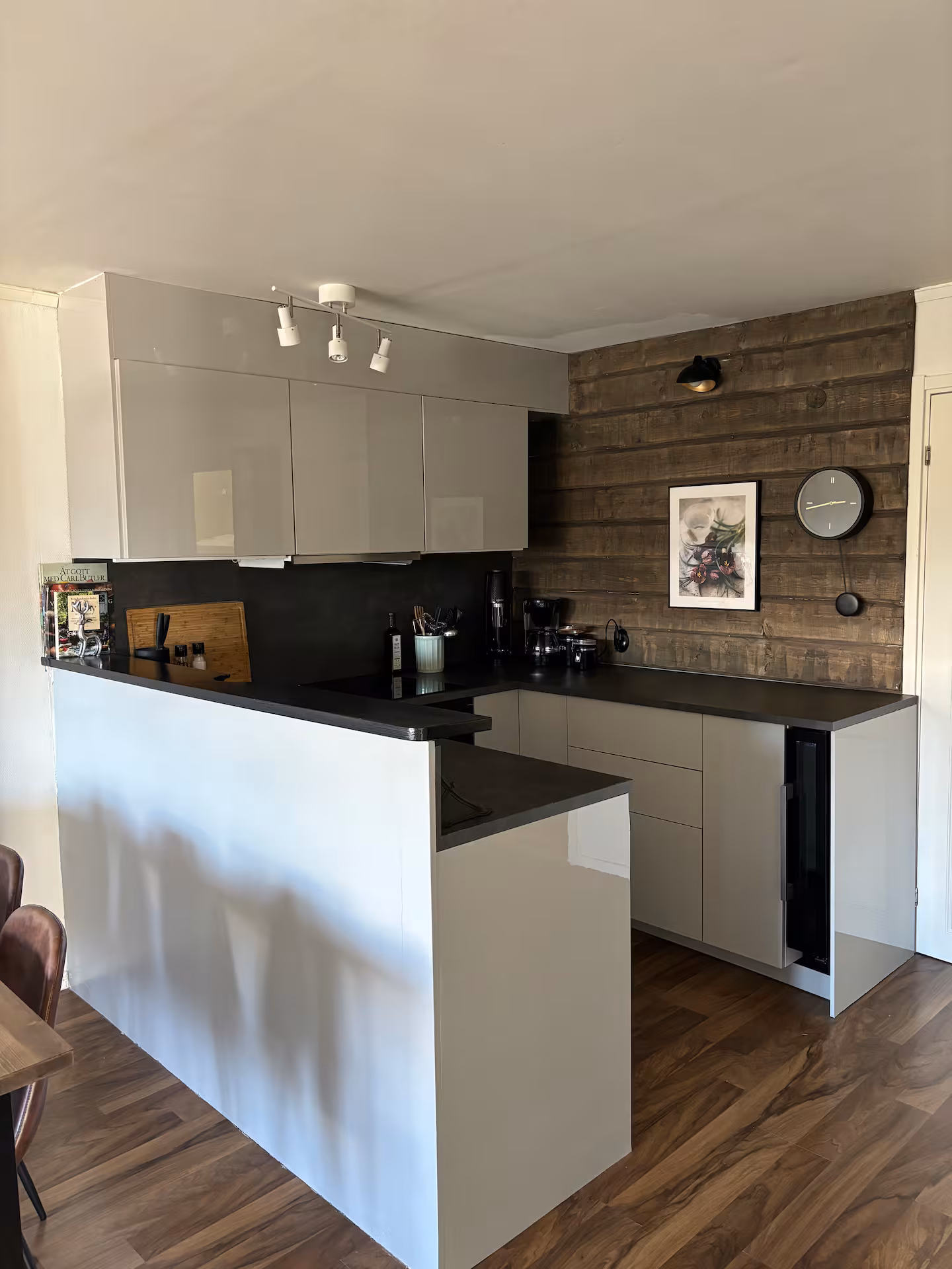 Kök och vardagsrum har en öppen planlösning för en social yta. I vardagsrummet finns även en liten eldstad som drivs med sprit.