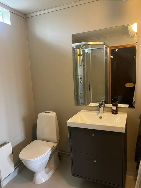 Badrummet består av ny modern inredning med toalett, kommod, handfat samt duschkabin, och för att inte glömma bastu.